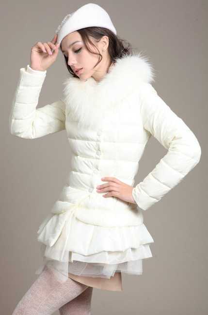 百褶下摆设计的白色羽绒服,奢华的貂毛领子,时尚又不失甜美,穿搭低调的浅驼色毛呢裙和甜美感的白色丝袜,演绎出甜美小公主范,在冬日再配搭高贵白色礼帽,甜美时尚感尽显!