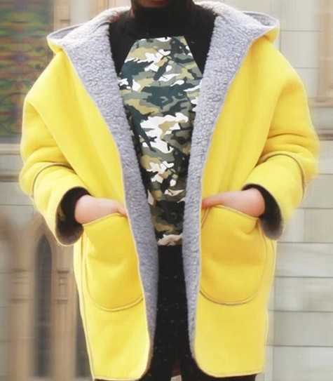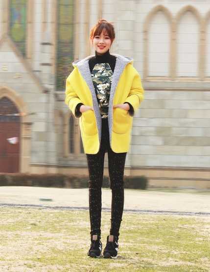 暖暖的羊羔绒大衣,抢眼的亮黄色,一扫冬日单调沉闷格调。