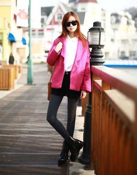 独特时尚的粉色翻领毛衣外套,超美的感觉,内搭简约的白色衬衫,穿出独特时尚范儿,搭配经典黑色短裤,让你穿出时尚又不臃肿装扮,打造冬日名媛范。