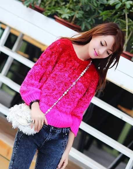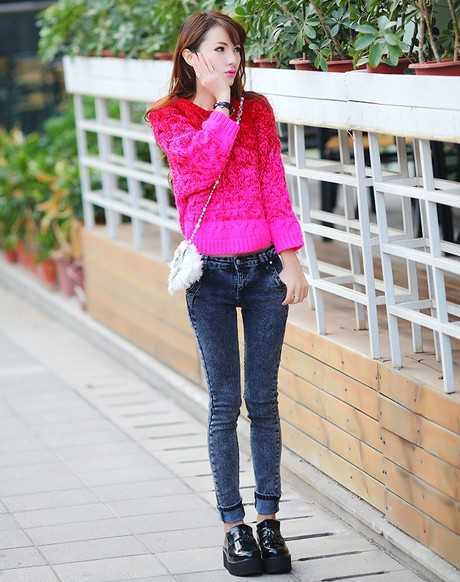 抢眼的玫红色宽松毛衣,不仅时尚更显皙白肤色,搭配帅气时尚的牛仔裤,一身时尚优雅的装扮,让你这个冬季分外时尚。