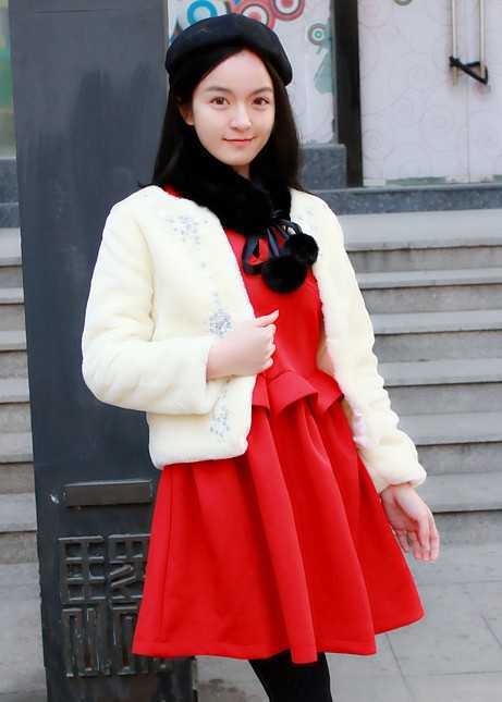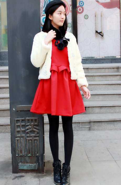 甜美感十足的新年红连衣裙,外搭小公主范的皮草外套,尽展甜美小公主范儿,下身搭配显高显瘦的打底裤和黑色短靴,巧妙搭配给人一种超显高的视觉感受,轻松打造出完美好身材。