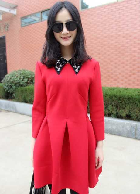 高腰百褶款的新年红连衣裙,是展现 恬静乖巧气质的搭配利器,轻松让你穿出恬静又不失时尚感的冬装,搭配超显高显瘦的黑色 打底裤和藏蓝色高跟短靴,尽展完美好身材曲线,美翻整个冬季!
