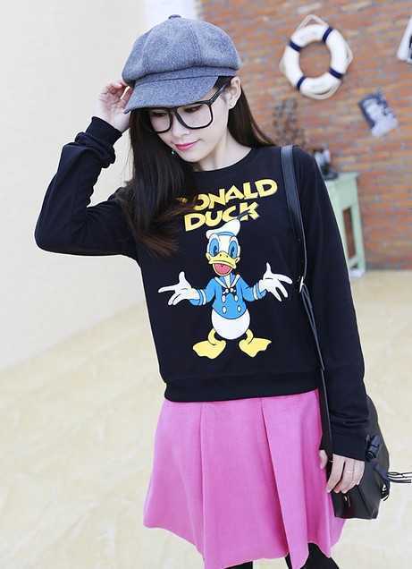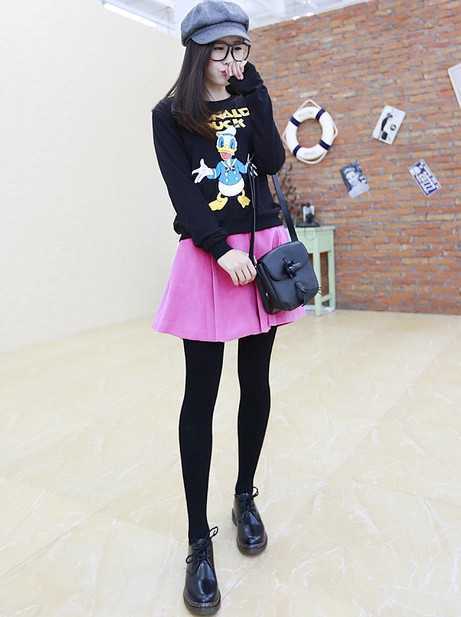 羊绒玫红色百褶短裙,搭配百搭可爱的唐老鸭毛衣,秀出高挑好身材,搭配黑色时尚短靴,穿出韩范十足冬季装扮。