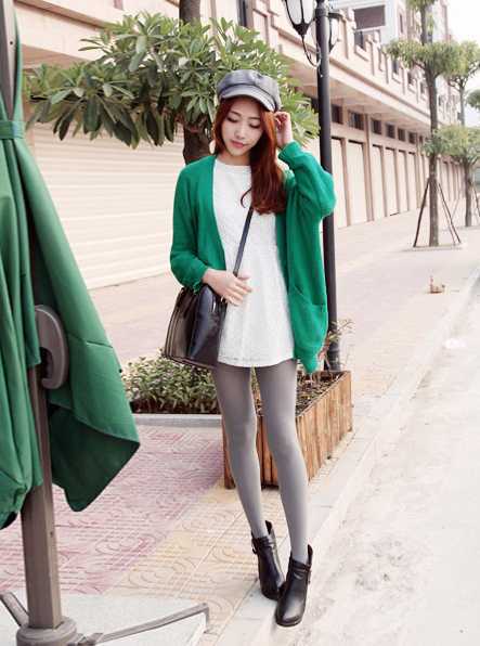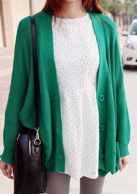 大大宽松的青色针织开衫,给人一种慵懒舒适感觉,内搭淑女纯白色裙子,彰显小清新时尚范儿,衬托出白皙好肤色,一缕阳光春意。