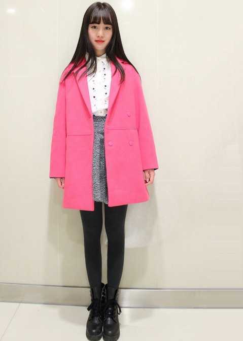 韩版的双排扣蜜桃粉毛呢大衣,随意内搭纯白色高领打底衫和百褶时尚短裙,衬托出润红肤色,穿出时尚感十足的冬日装扮。