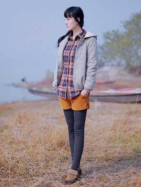 百搭休闲款的冬季灰色外套,搭配英伦风的格子衬衫,增添几分时尚感,搭配姜黄色短裤和驼色鞋子,轻松穿出温暖时尚冬日搭配。