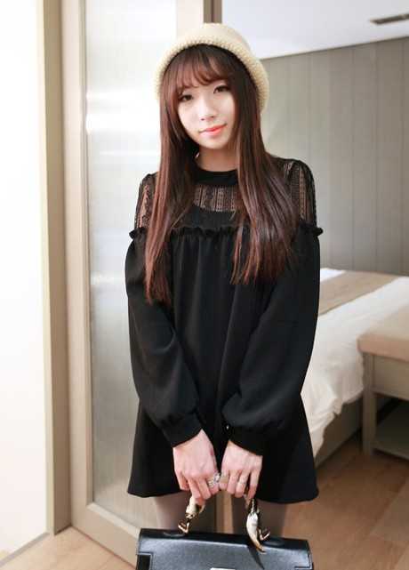 小性感的蕾丝黑色雪纺连衣裙,显瘦又百搭,搭配棕色显瘦打底裤,凸显出完美纤细腿形曲线,穿出时尚淑女范儿。