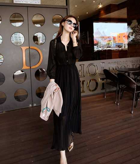 显瘦又百搭的百褶款黑色雪纺连衣裙,波西米亚风格的裙子,穿出异域风情味儿,搭配尖头高跟鞋,穿出温婉时尚感装扮,完美展现出女性温婉柔美的一面。