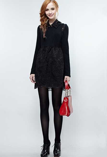 欧根纱蕾丝黑色连衣裙,给人一种干练女强人感,搭配黑色打底裤和鞋子,穿出大气时尚范儿,一身黑色系的装扮加上鲜艳红色的包包,瞬间提升迷人淑女气质,尽展出优雅迷人女性气质。