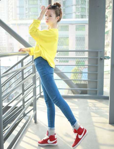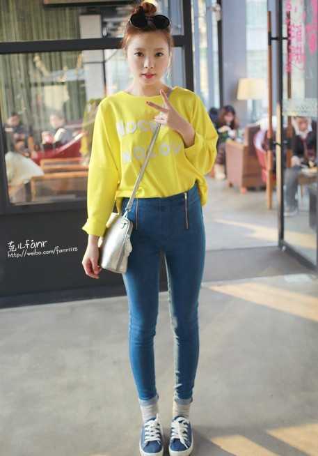 甜美风格春季亮黄色套头卫衣 春季撞色亮黄色套头卫衣,搭配高腰紧身牛仔裤,凸显出纤细腰身曲线,穿出俏皮时尚感,最适合娇小个子搭配了。