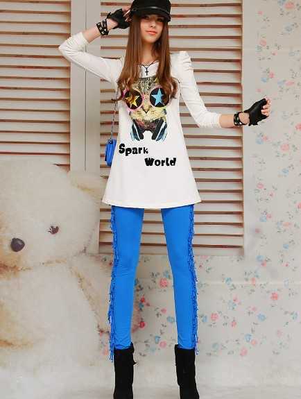 韩版白色连衣裙,简约百搭款式,随意搭配亮眼蓝色打底裤,很显曼妙好身材,搭配黑色高跟靴,展现不一样的时尚范儿。