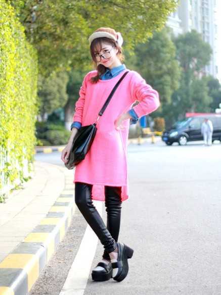 超有范儿的春季粉色长款套头毛衣,时尚内搭帅气牛仔衬衣,很青春靓丽,搭配黑色打底裤和鞋子,一身低调又不失时尚感的淑女装扮,聪明的MM们怎会错过呢!