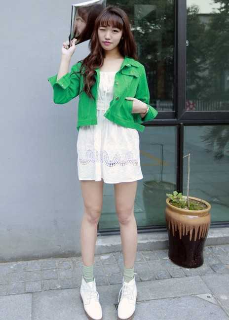 洋溢着春季气息的春季绿色薄款牛仔衫,清新又大气,搭配性感仙美白色连衣裙,完美打造出小清新公主范儿。