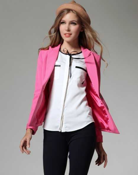 春季玫红色短款小西装,搭配简约白色上衣和黑色裤子,经典的黑白搭配,是时尚OL们最爱的搭配法,轻松打造出都市OL时尚范儿。