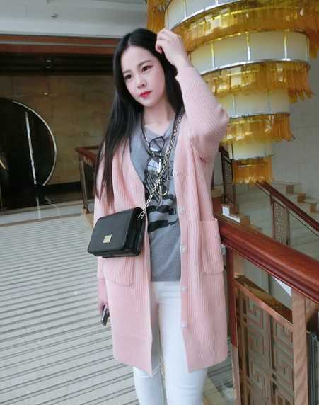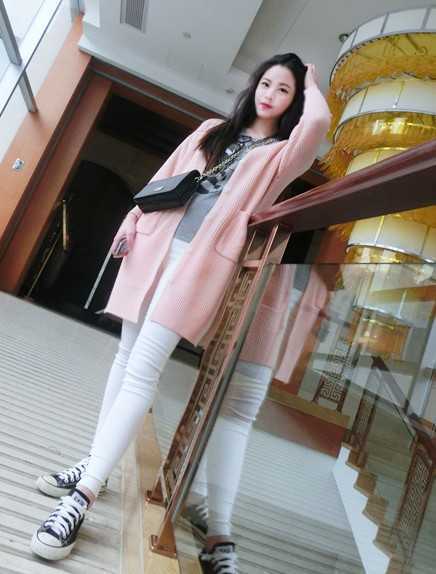 春季粉红色超长款针织开衫,特别适合高个子MM们穿着。