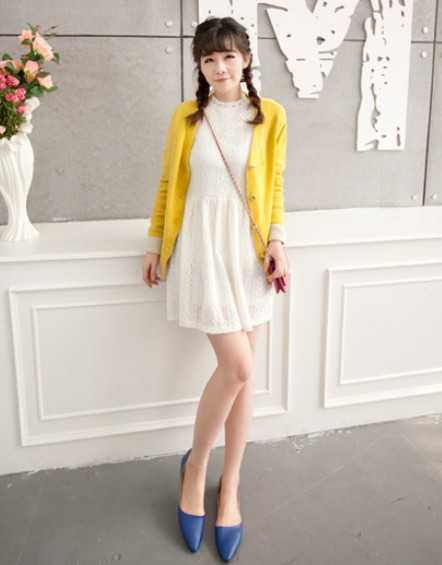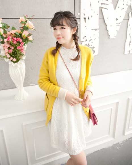 优雅的白色连衣裙,巧妙搭配黄色小清新开衫,H型的显瘦搭配法,不妨学一下吧。