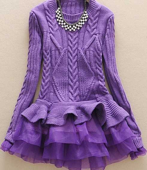 春季紫色毛衣裙,仙美欧根纱蓬蓬下摆,甜美又时尚。