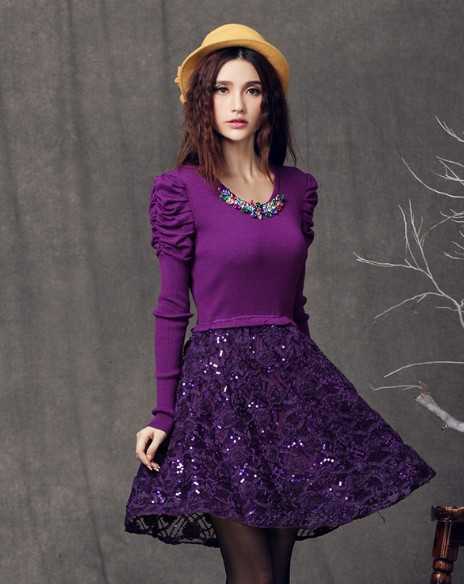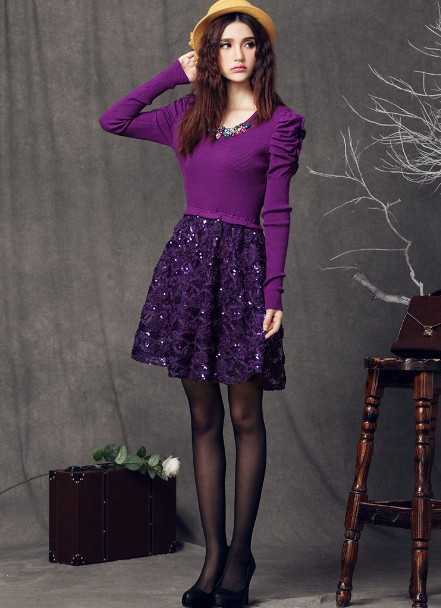 充满浪漫色彩的春季紫色毛衣裙,高腰的设计很显高挑身材,矮个子MM们也能轻松hold得住。