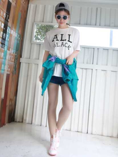 宽松款春季青色薄款外套,充满着春天的气息,搭配清爽白色T恤衫,很随性好看,搭配黑色短裤 和粉嫩帆布鞋,尽展出休闲街头风范儿。
