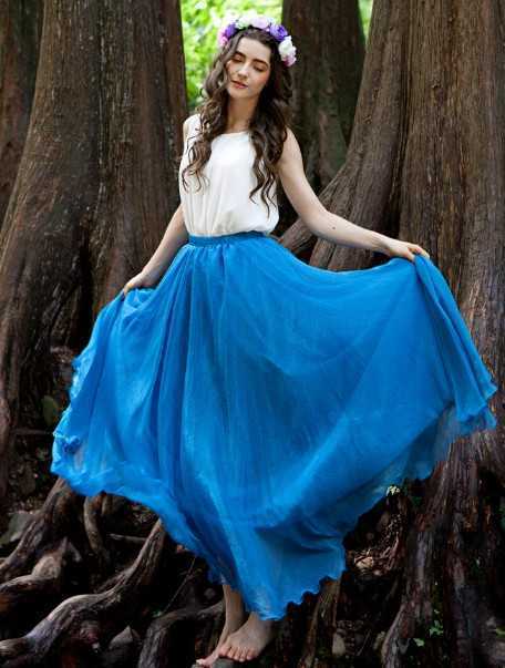 春季飘逸大裙摆蓝色雪纺裙,随风飘起很仙美迷人,搭配高贵的裸色高跟鞋,更增添迷人气质,加上美仙子的花环,温婉仙美气质尽展。