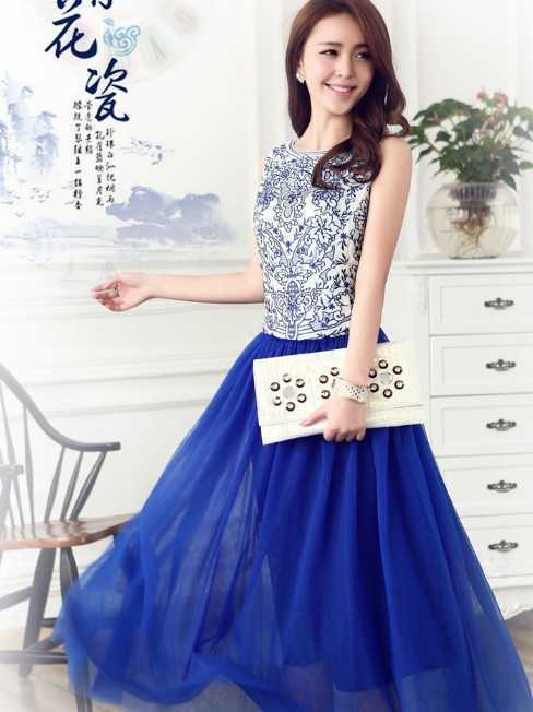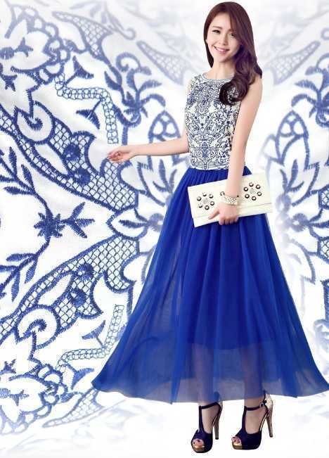 一条高贵的春季刺绣青花瓷雪纺连衣裙,很飘逸好看。
