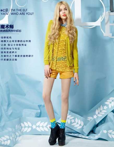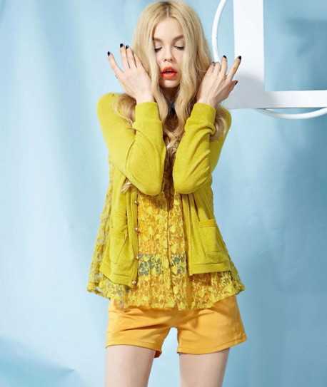 欧美范春季黄色针织衫,大面积的蕾丝点缀着,增添几分性感气息,搭配黄色短裤和黑色高跟鞋,尽展出欧美大气范儿。