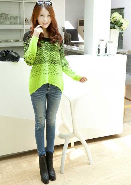 扑鼻清新的春季绿色套头衫,渐变色设计更凸显出时尚感,搭配帅气紧身小脚裤,凸显出高挑身材,加上黑色短靴,穿出养眼靓丽装扮。