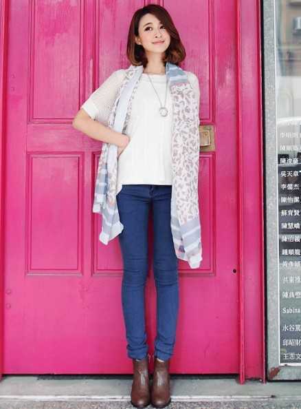 春季白色镂空罩衫,搭配蓝色紧身牛仔裤,搭配复古风短靴,完美凸显出高挑好身材,加上仙美十足的围巾,尽展出柔美女性魅力 。