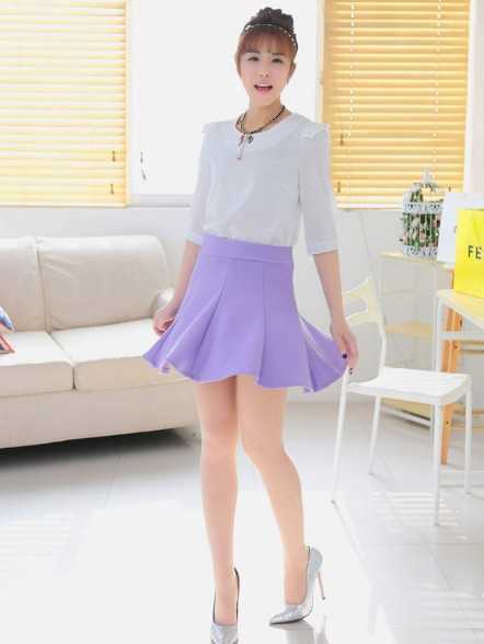 春季紫色小短裙,搭配白色雪纺衫,高腰的百褶裙很显高时尚,搭配银色高跟鞋,完美高挑身材尽展。
