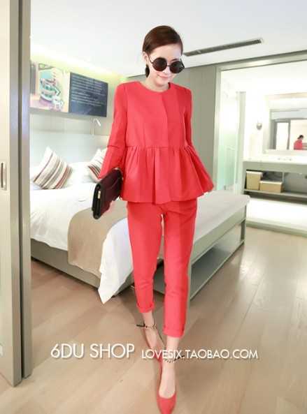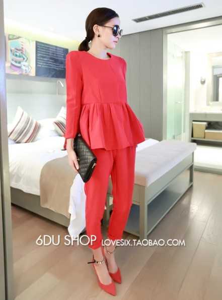 春季修身红色西裤,完美拉长腿部纤细曲线,搭配红色百褶娃娃衫,超有范抢眼,搭配红色高跟鞋,一身超大气红色装扮,让你回头率 百分百,随意手拿黑色包包,尽展精致女人味。
