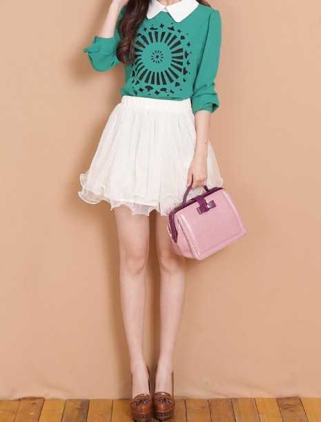 甜美款的白色半身裙,仙美蕾丝点缀,增添几分女人味,搭配青色雪纺衫,青春又显时尚感,搭配棕色高跟鞋和淑女款小包包,甜美公主范尽展。