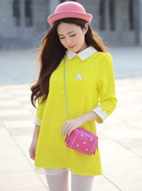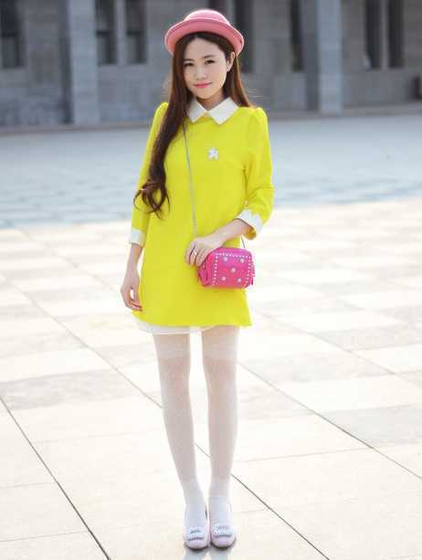 娃娃领黄色连衣裙搭配