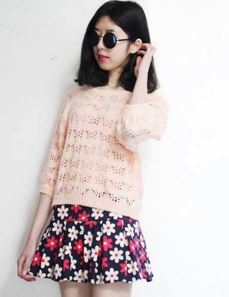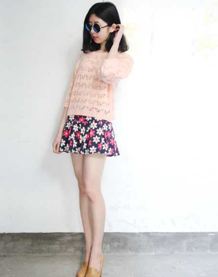 日系嫩粉色镂空毛衣,性感又显甜美感,搭配浪漫花朵百褶短裙,很有文艺范儿,搭配卡其色高跟鞋,秀出高挑好身材,甜美文艺范尽展。