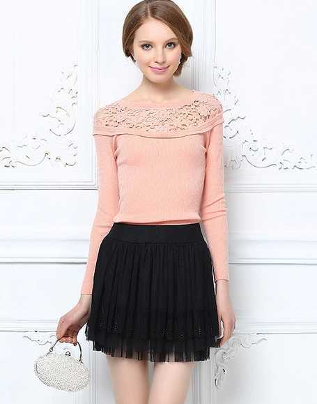 韩范十足嫩粉色镂空毛衣,精美的碎花蕾丝点缀,很仙美好看,搭配黑色蓬蓬短裙,完美遮住肉PP ,搭配米色高跟鞋,优雅气质尽展。
