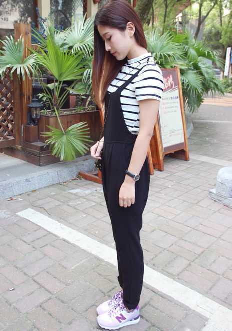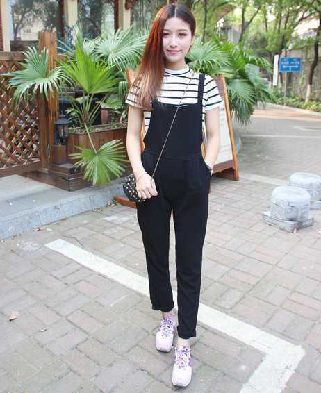 简约韩版黑色背带裤,黑白搭配很减龄时尚。