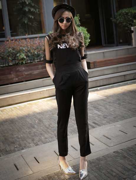 休闲黑色背带裤,很复古时尚,搭配黑色雪纺短袖衫,微露肌肤显时尚感,搭配银色高跟鞋,很显时尚范儿。