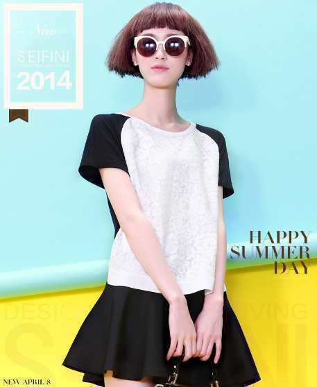 夏季圆领白色雪纺衫,蕾丝设计增添甜美感,搭配黑色白色短裙,轻松秀出纤细美腿,经典黑白搭配不失时尚感。