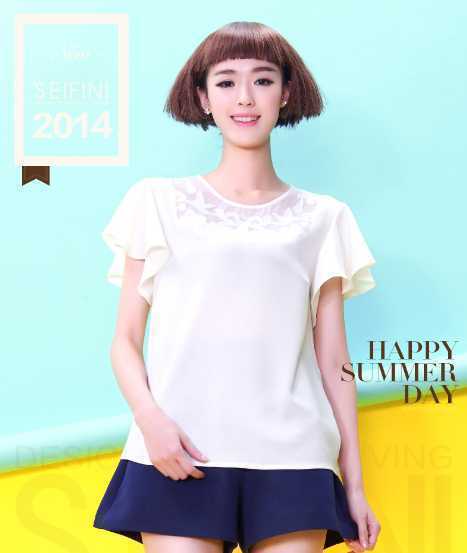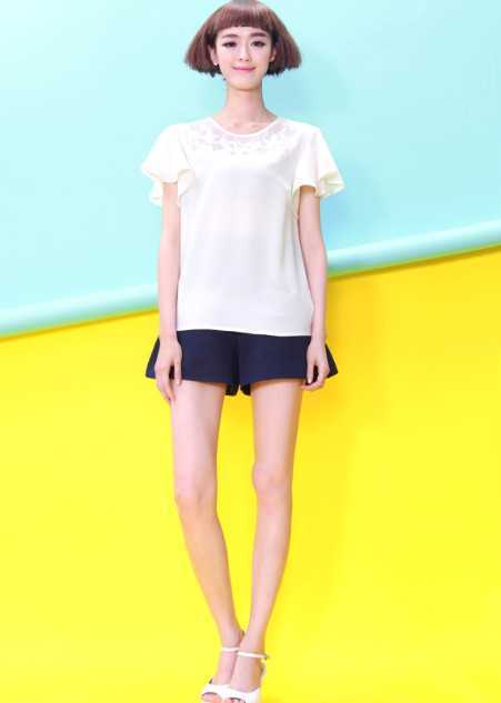 基本款圆领雪纺衫,独特褶皱袖子,轻松遮住蝴蝶袖。