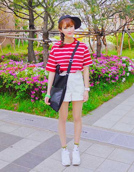 BF风粉红色短袖T恤,给人一种甜甜的感觉,很亲切,搭配高腰白色短裤,凸显纤细小蛮腰,白色运动鞋穿着,让你夏天随时活力运动起来。