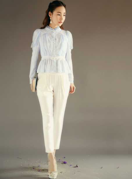 欧式小清新雪纺女衫,搭配修身白色休闲裤,优雅大气,搭配白色高贵高跟鞋,凸显高挑身材,手拿着书本,充满文艺女青年气息。