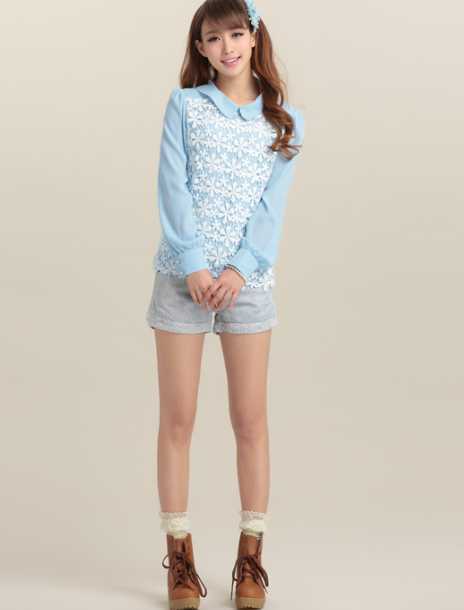 娃娃领蕾丝拼接雪纺衫,立体白色蕾丝点缀,增添小清新少女气质,搭配洗水牛仔短裤,清凉逼人, 白色袜子+复古短靴,打造文艺女青年范。