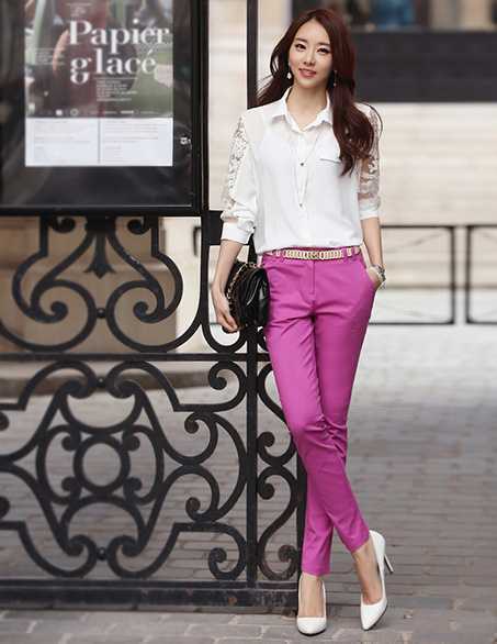 通勤款的仙白色蕾丝衬衫,袖子融入镂空蕾丝元素,让你穿着更显女人味,搭配养眼玫红色西裤,彰显率性时尚感,搭配白色高跟鞋,优雅且显高。