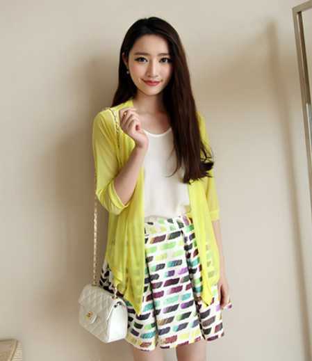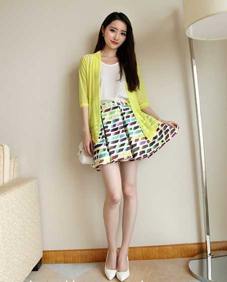 果冻黄防晒衫,超薄款式,炎热夏天既能防紫外线又能秀时尚,拼色款百褶连衣裙是今年最流行款,减龄又青春,穿上白色高跟鞋,瞬间让你华丽蜕变。