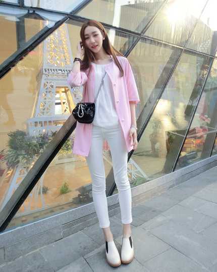 果冻粉防晒衫,长款款式能更好遮住肌肤,以免晒伤,白色雪纺衫+白色小脚裤+小白鞋,简直是美呆了,清纯极致。