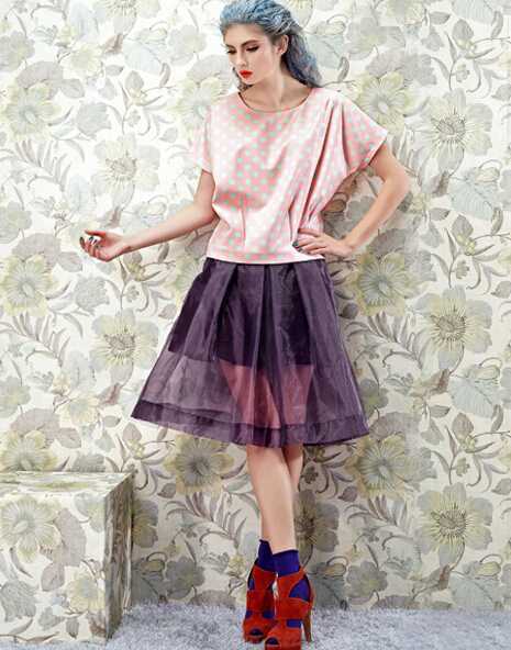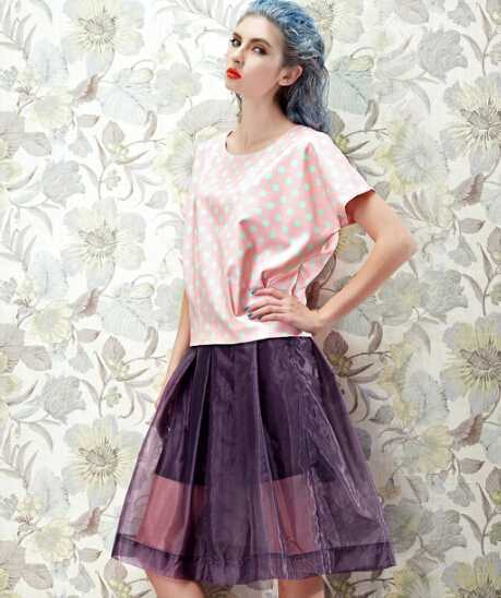浪漫轻盈紫色夏季半身裙, 半透视的面料让你若隐若现露出更性感诱人,搭配波点t恤衫,俏皮可爱。搭配魅力红色高跟鞋,秀出纤细好身材,尽展复古典雅气质美。