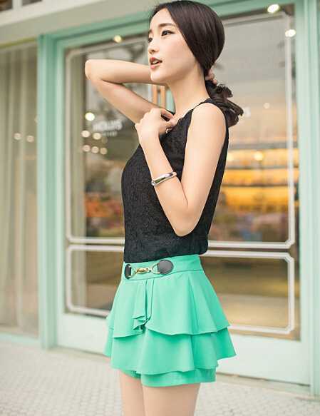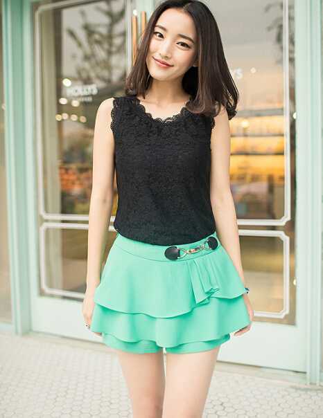 神秘的黑色总能吸引MM们的目光,百搭时尚更显瘦,这款经典黑色背心衫,魅力的蕾丝点缀,更具有性感女人味,搭配薄荷绿短裤,让你夏天一次尽情清凉快感。