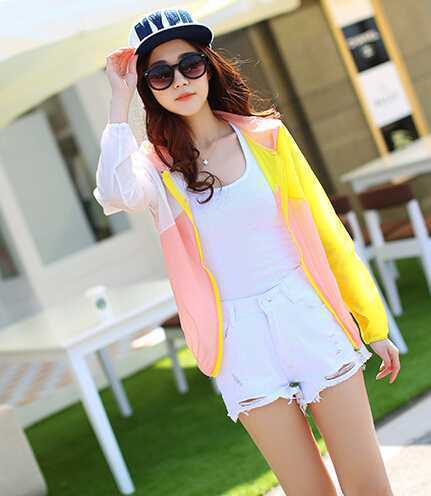 撞色的糖果色防晒开衫,穿出运动休闲风,搭配白色t恤衫和白色破洞短裤,个性潮流显时尚,搭配运动鞋,随时随地让你运动起来。