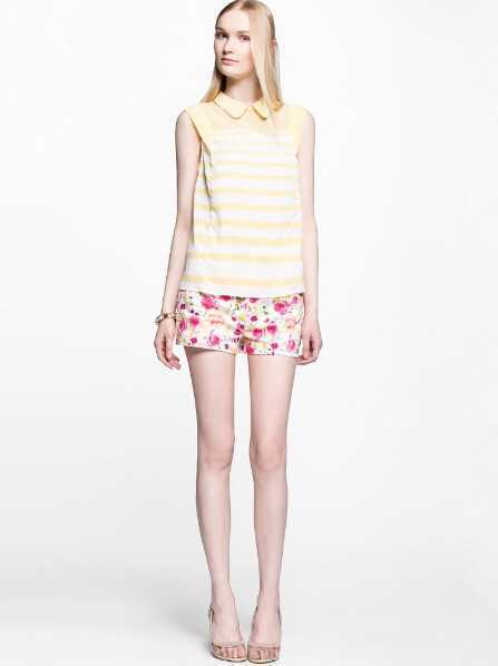淑女风亮黄色t恤衫,搭配浪漫碎花短裤,清爽之余显气质,搭配镂空透明高跟鞋 ,独特不失时尚感,立马让MM高人一等显高挑美。
