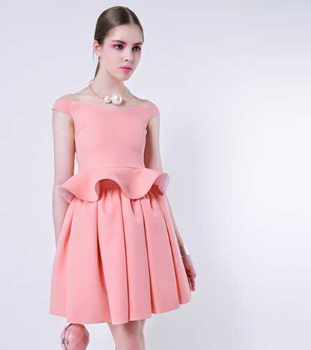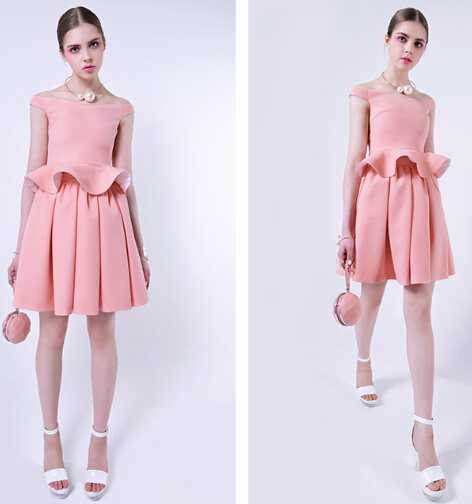 粉色最能凸显女生甜美可爱气质,欧洲站小香风纯粉色连衣裙,性感一字领显妩媚,搭配白色高跟凉鞋 ,优雅大气显高挑。