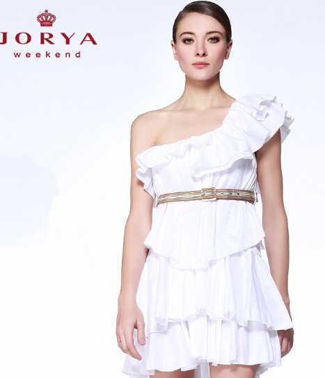 优质纯棉纯色连衣裙,优雅单肩造型设计,彰显奢雅名媛气质,精致多层褶皱与荷叶边设计 ,完美遮住赘肉显时尚 。